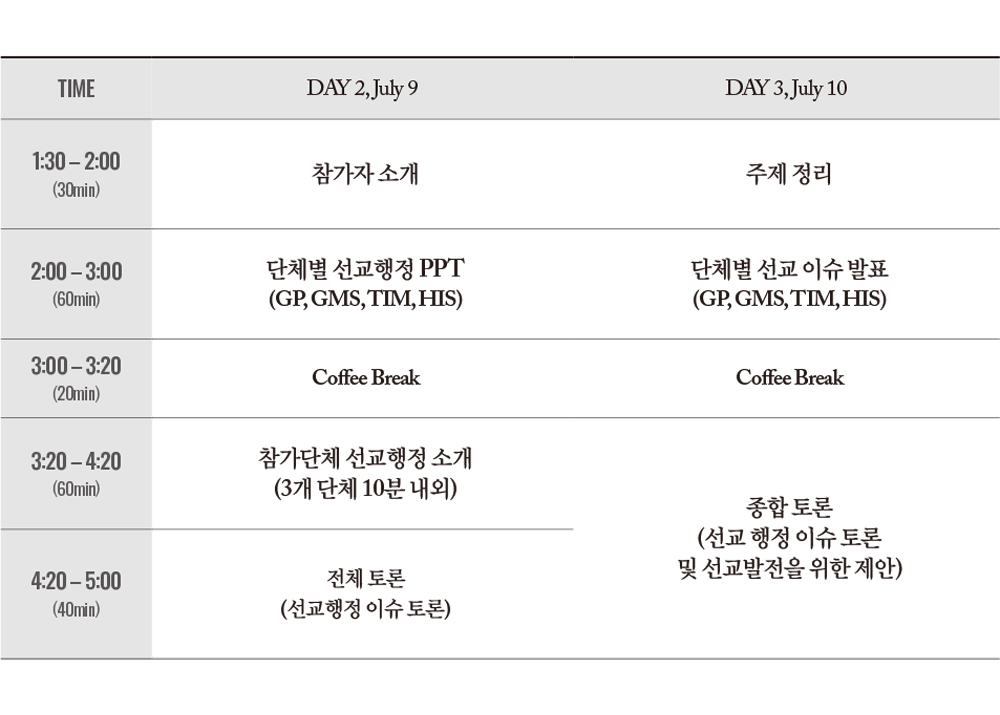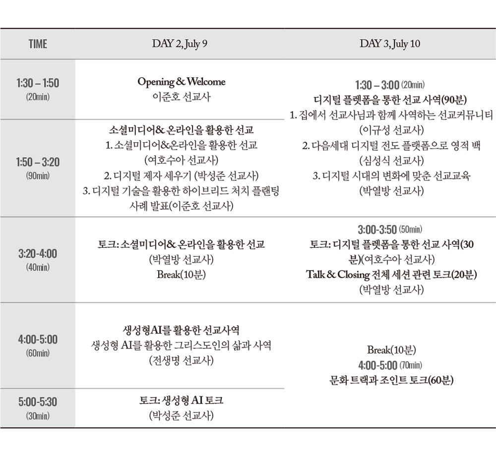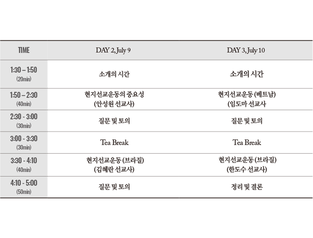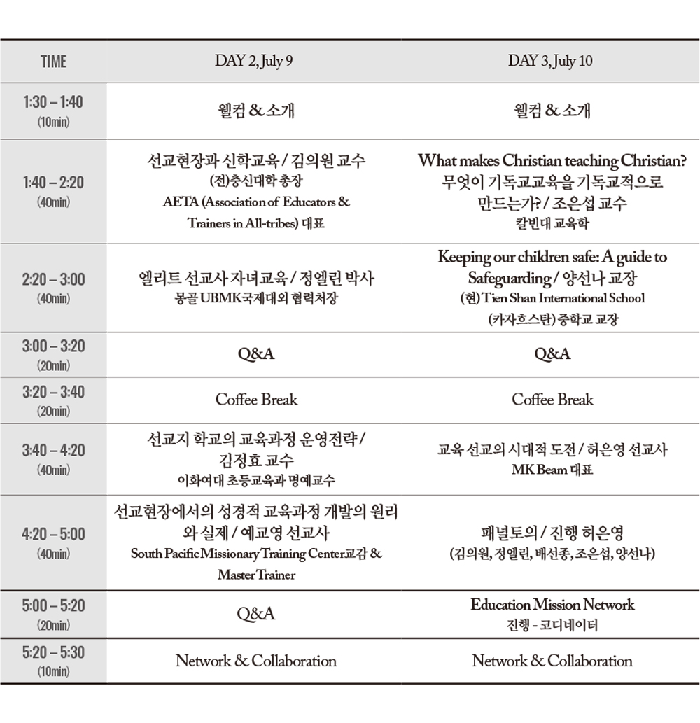 미래교육선교를 위해 다음세대에게 물려줄 유산으로 우리는 무엇을 준비하고 있는가? 초기 한국선교에서 교육선교는 선교의 시작이었고, 기반이었으며, 한 나라에 큰 영향력을 주었을 뿐만 아니라 그 영향력은 현재까지 지속되고 있다. 이렇듯 교육선교는 선교의 핵심 전략이고 개인과 사회와 나라의 미래이며 선교의 가장 중심에서 그 역할을 감당하고 있다. 변화하는 세상에 복음의 빛을 전하기 위해, 각 세대와 지역과 영역들이 연결되어 함께 동행하며 교육선교의 미래를 만들어가는 공동체를 꿈꾼다.