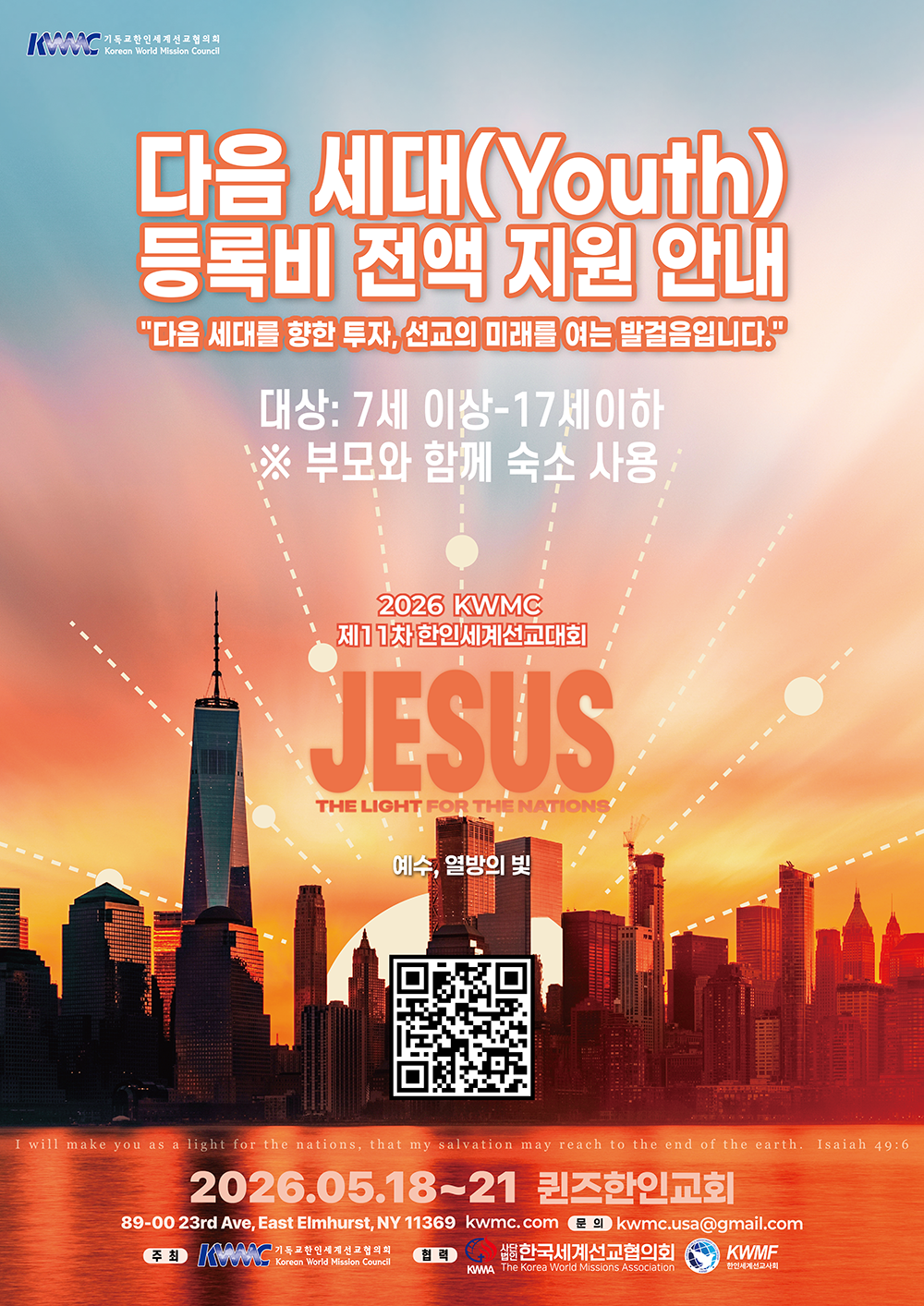 그러나 이번 대회의 장소를 제공하는 퀸즈한인교회(The Korean Church of Queens)의 전격적인 결정으로, Youth 참가자 전원의 등록비를 전액 지원하기로 하였습니다.